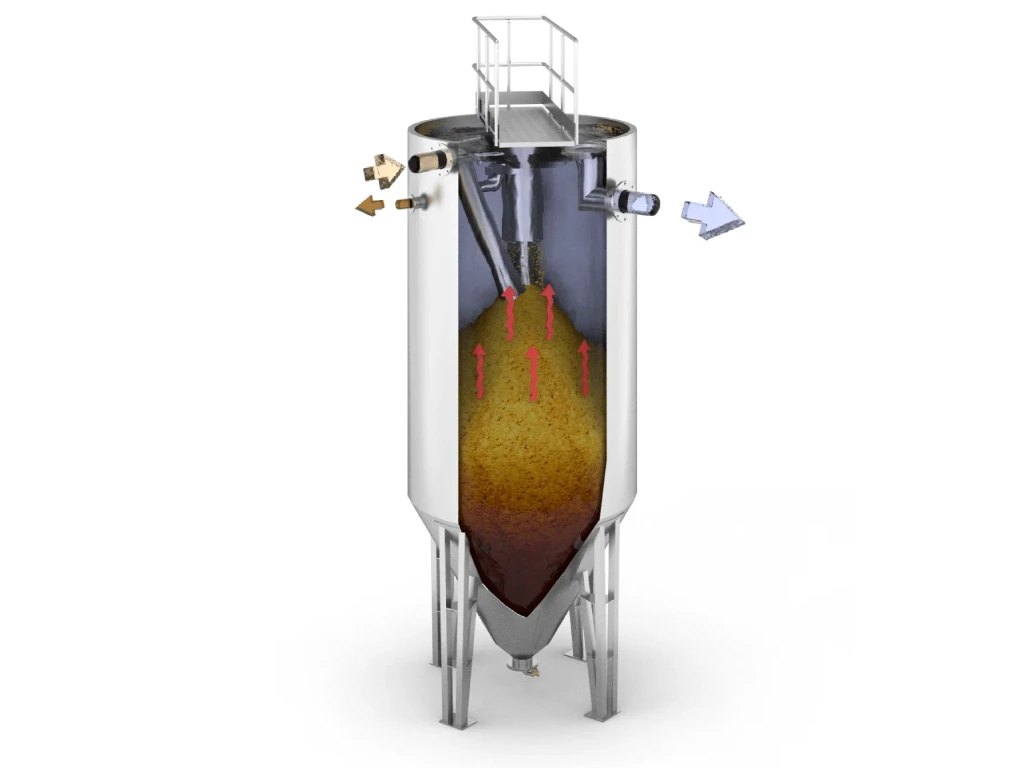 خوراک ورودی از بالای فیلتر (A) وارد شده و از طریق یک بخش حلقوی (B) بین لوله ورودی و محفظه هواکش به سمت پایین جریان می یابد. خوراک از طریق یک سری شعاع های ورودی (C) که در پایین باز هستند، به پایین بستر شنی وارد می شود. با جریان ورودی به سمت بالا (M) از طریق بستر شنی متحرک به سمت پایین (D) ، ناخالصی های آلی و معدنی توسط شن گرفته می شوند. فیلتراسیون تمیز و صیقلی به حرکت خود به سمت بالا ادامه داده و از بالای فیلتر از روی سریز فیلتراسیون (J) خارج شده و از طریق لوله خروجی (E) خارج می شود.