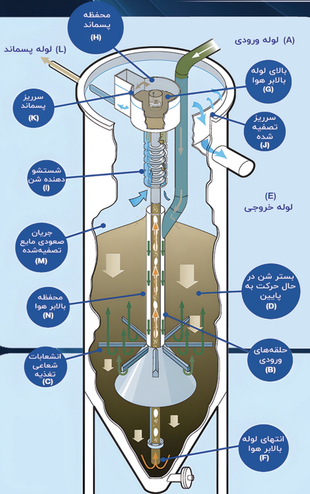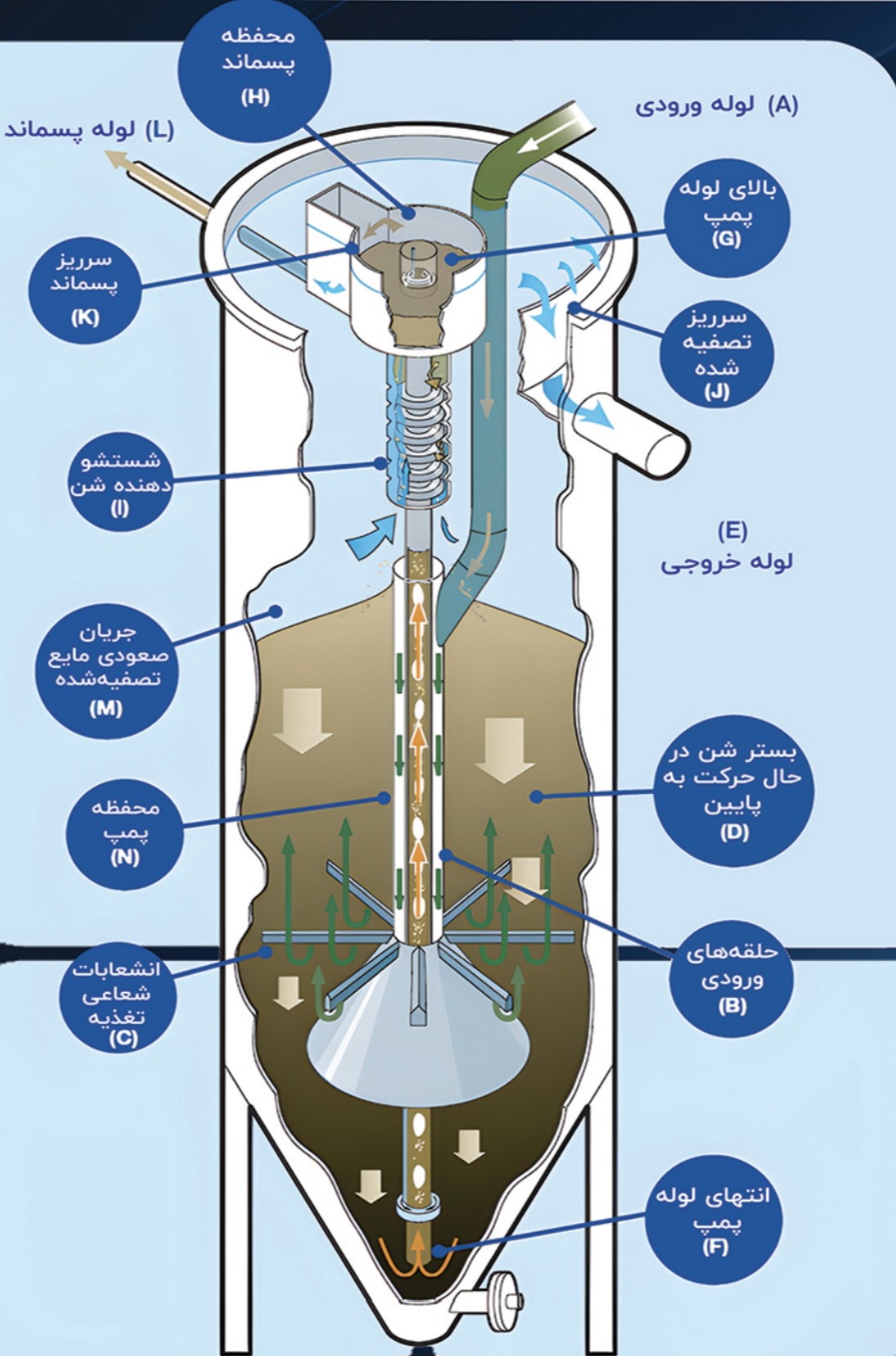 بستر شنی حاوی ناخالصی های جذب شده به سمت پایین و در اطراف مرکز فیلتر، جایی که لوله پمپ قرار دارد، کشیده می شود. حجم کمی از هوای فشرده به پایین پمپ (F) شلیک می شود و شن را به داخل لوله پمپ می کشد. شن با شدت در داخل لوله پمپ شسته می شود. اثر بخشی این فرایند شستشو بسیار بیشتر از آن چیزی است که می توان در شستشوی معکوس فیلتراسیون شنی معمولی انتظار داشت. شسشتو، هرگونه ذرات جامد چسبیده به دانه های شن را جدا می کند. دوغاب کثیف به بالای ایرلیفت (G) و به داخل محفظه پسماند (H) رانده می شود. از محفظه پسماند، ماسه به داخل دستگاه شسشتوی شن (I) می ریزد و جامدات دفع شده سبک تر از طریق سرریز پسماند (K) حمل شده و از لوله پسماند (L) خارج می شود.